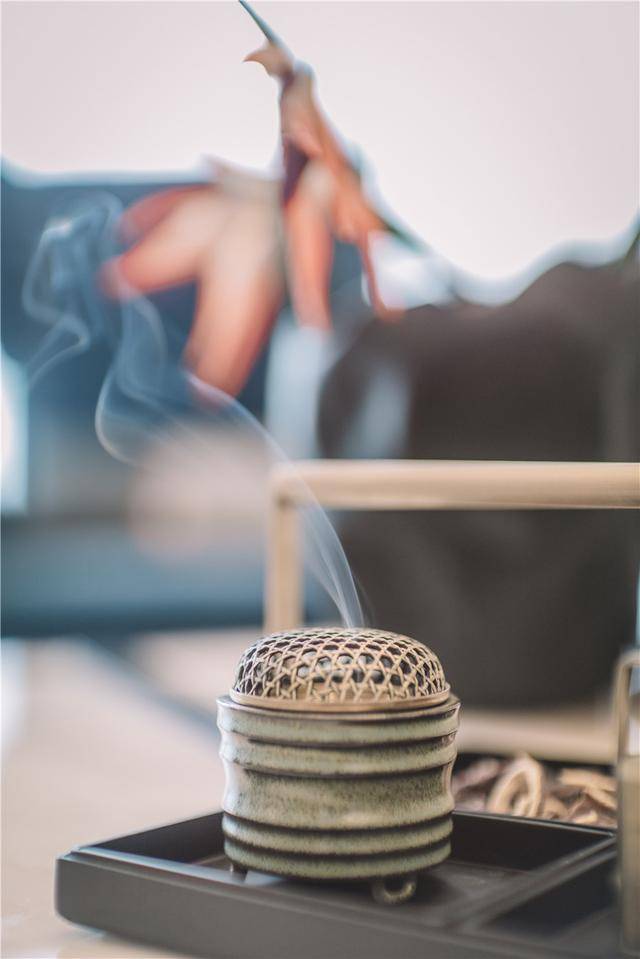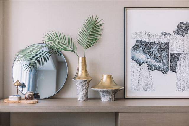 空间主打大地色调,偶尔带出的知性蓝与令人喜悦的橘色跳脱氛围,以及软装陈设摒弃常规堆砌方式,以谦逊的姿态让位于空间的精致与静谧。如空间多处用到装置替代常规挂画,以及为了创造空间不同的层次感,择选抽象笔触面料打破中式的固有沉稳,在不经意中诠释美好的生活意境。