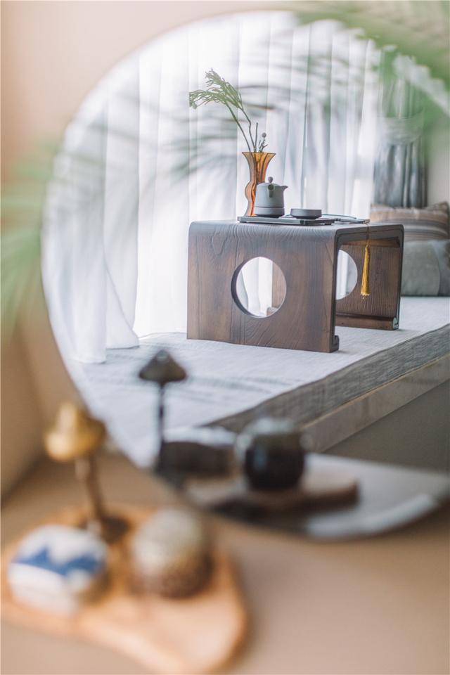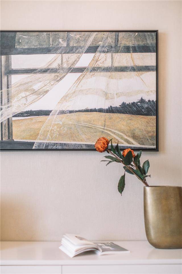 卧室空间以实木家具与棉麻材质勾勒出简洁舒适生活。装饰画是空间的一大亮点,画中被微风吹起的白帘,静中有动,以趣味表达于生活的情趣。特别提到的是,空间陈设运用了如陈皮、当归等食膳元素,在厨房、客厅等空间不经意出现,设计希望通过气味与实物质感,在触感、味觉上诠释知性家庭对生活健康的追求。