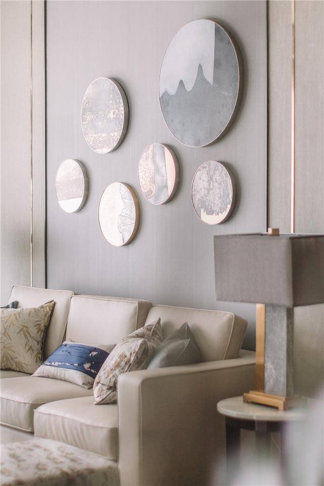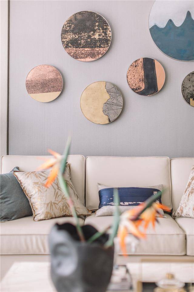 客厅干净通透,大落地窗接纳来自自然的悸动。水墨意境的蓝金沙电视墙是空间的主角,设计师以一组圆形组合装置的沙发背景墙与之呼应,配合水墨元素的现代表达凸显中式内涵。