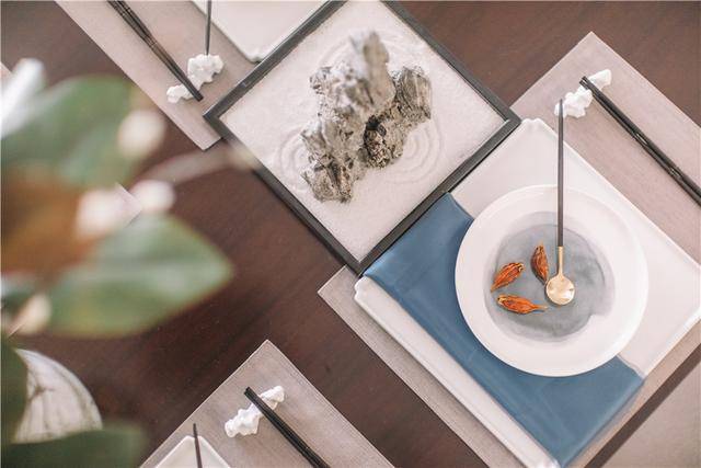 餐厅色彩上与客厅一致,黑白搭配橘色与蓝色,与摆放在餐桌上的餐具形成点到为止的关系。餐盘内的三颗干果,山型筷架与藏于餐盘底部的水墨画,设计用简洁的陈设语言,刻意营造精致与艺术的惊喜感。